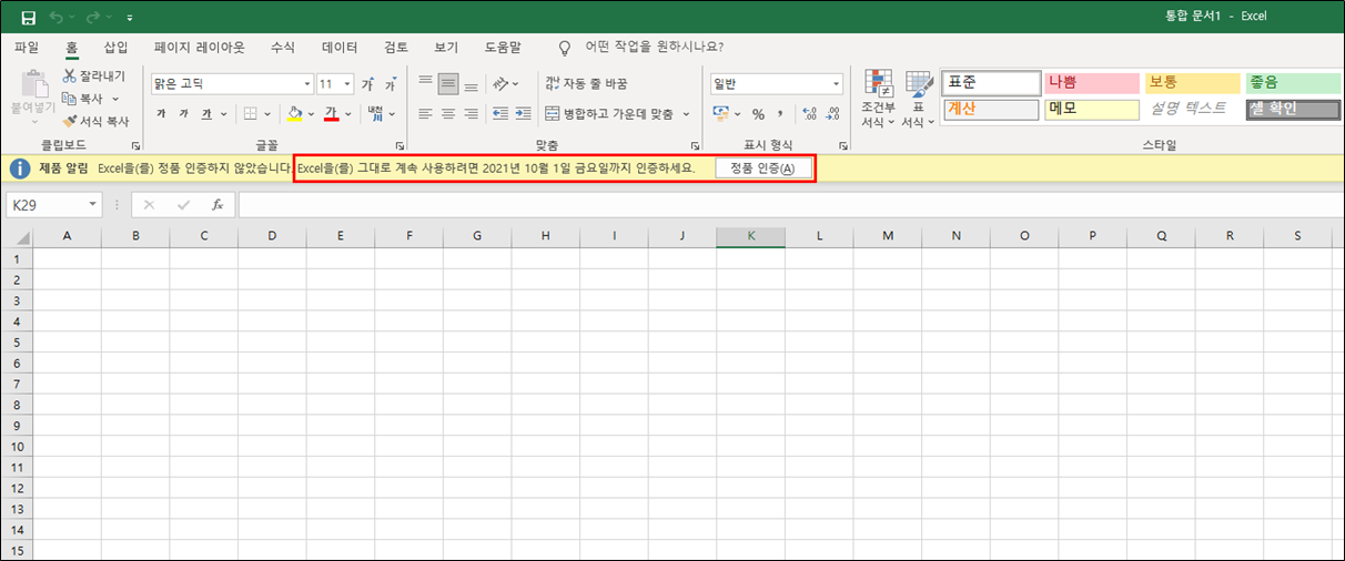 6. 오피스2019(엑셀 또는 파워포인트)를 실행하게 되면 아래와 같이 유효기간 표시 알림이 뜸