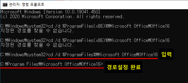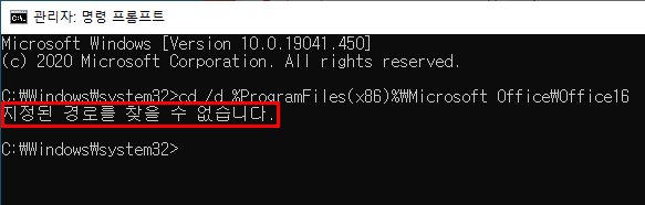 위와 같이 "지정된 경로를 찾을 수 없습니다." 메시지가 뜨는 경우 아래 문구 입력 후 엔터
